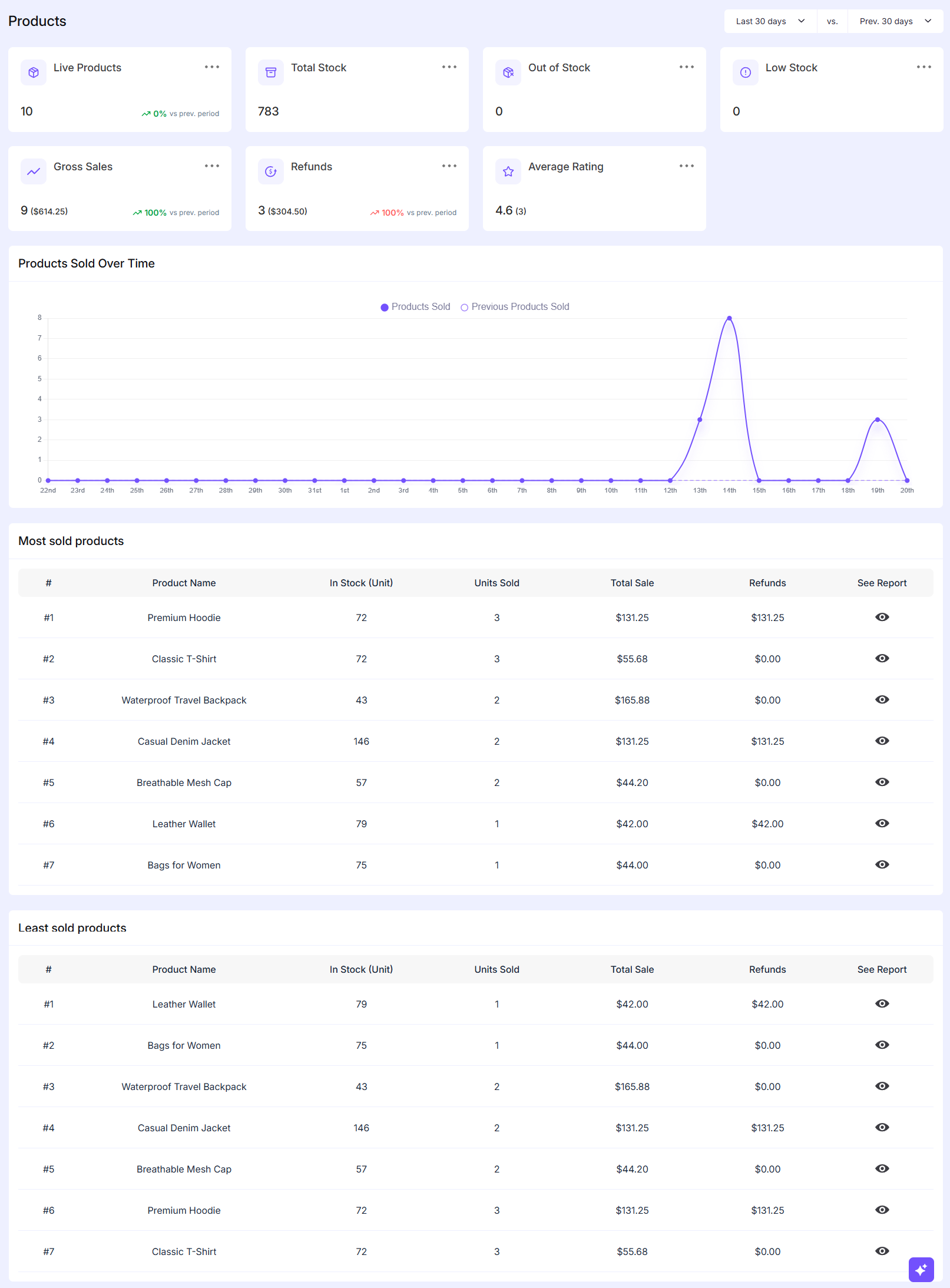 The Products Reports section helps you understand how each product is doing in your store. It shows important details like stock levels and sales activity in a clear and straightforward way so you can easily see performance at a glance.