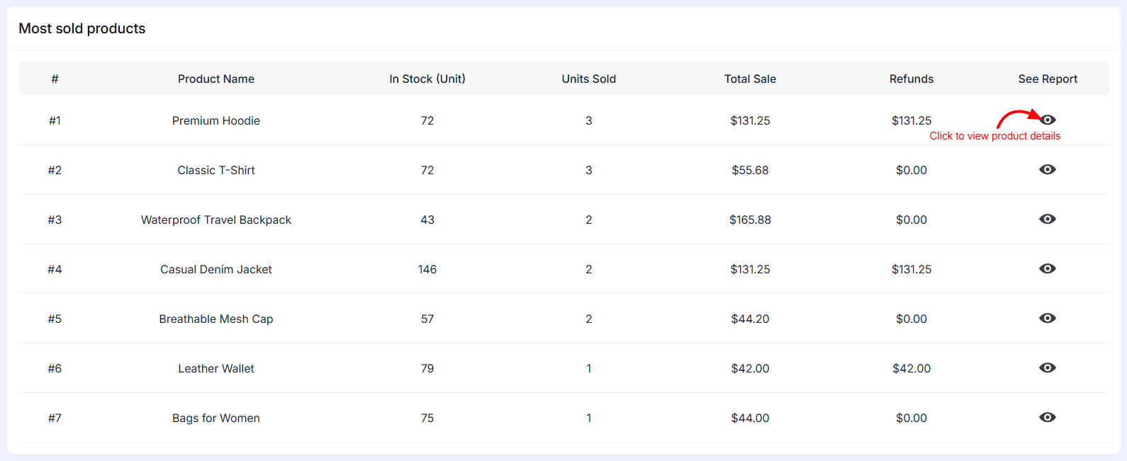 This section shows products with the lowest performance. Same columns as the Most Sold Products table are included. It helps you: