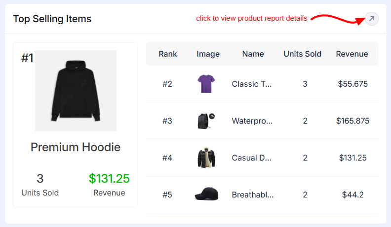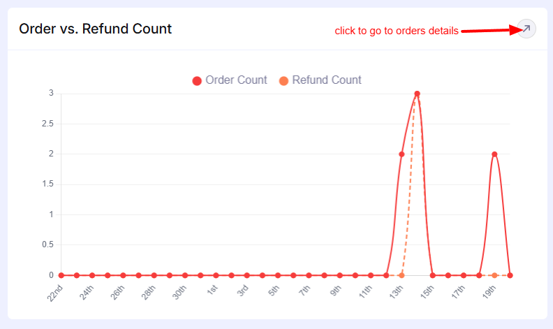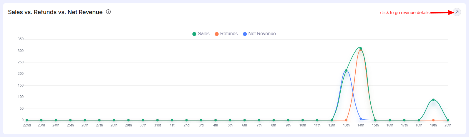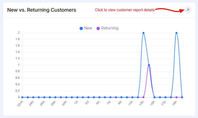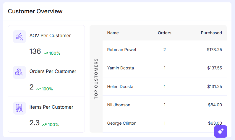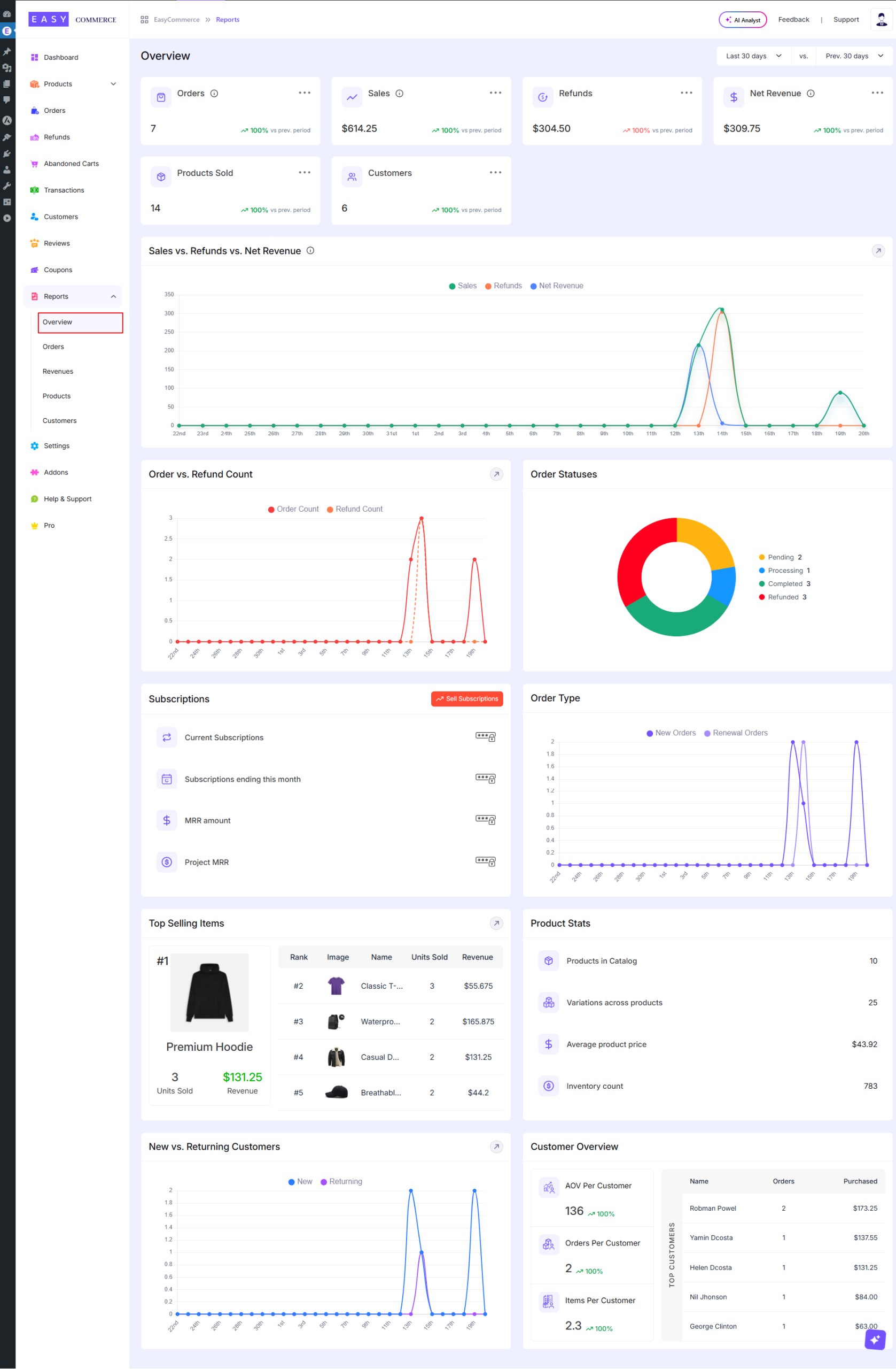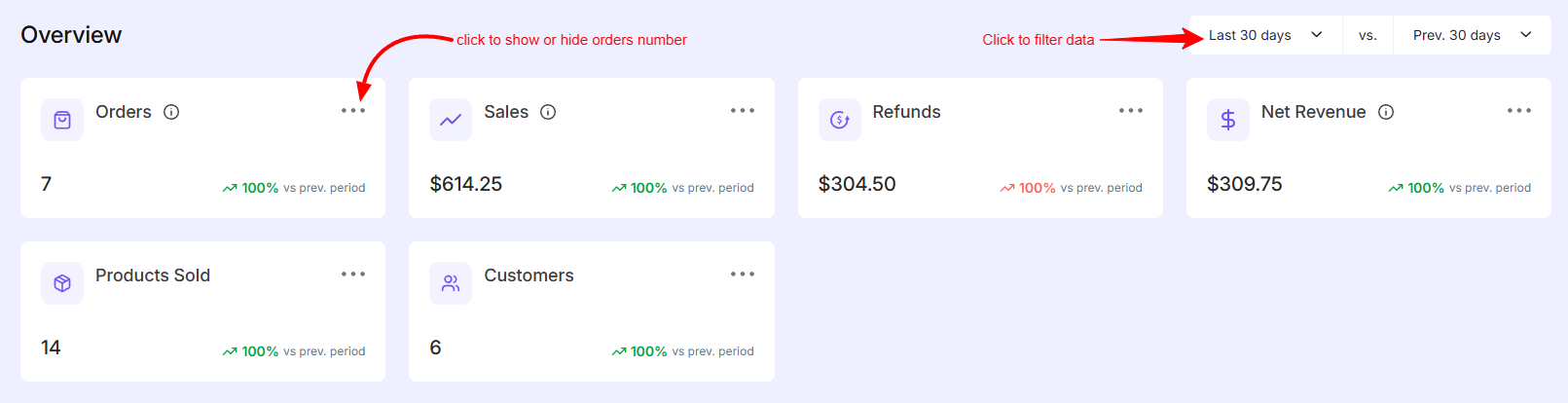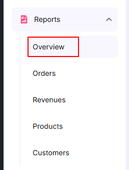 The Overview page is meant for quick insights. If you need deeper analysis orders, revenue, customers etc., you can go to the specific report sections from the sidebar.