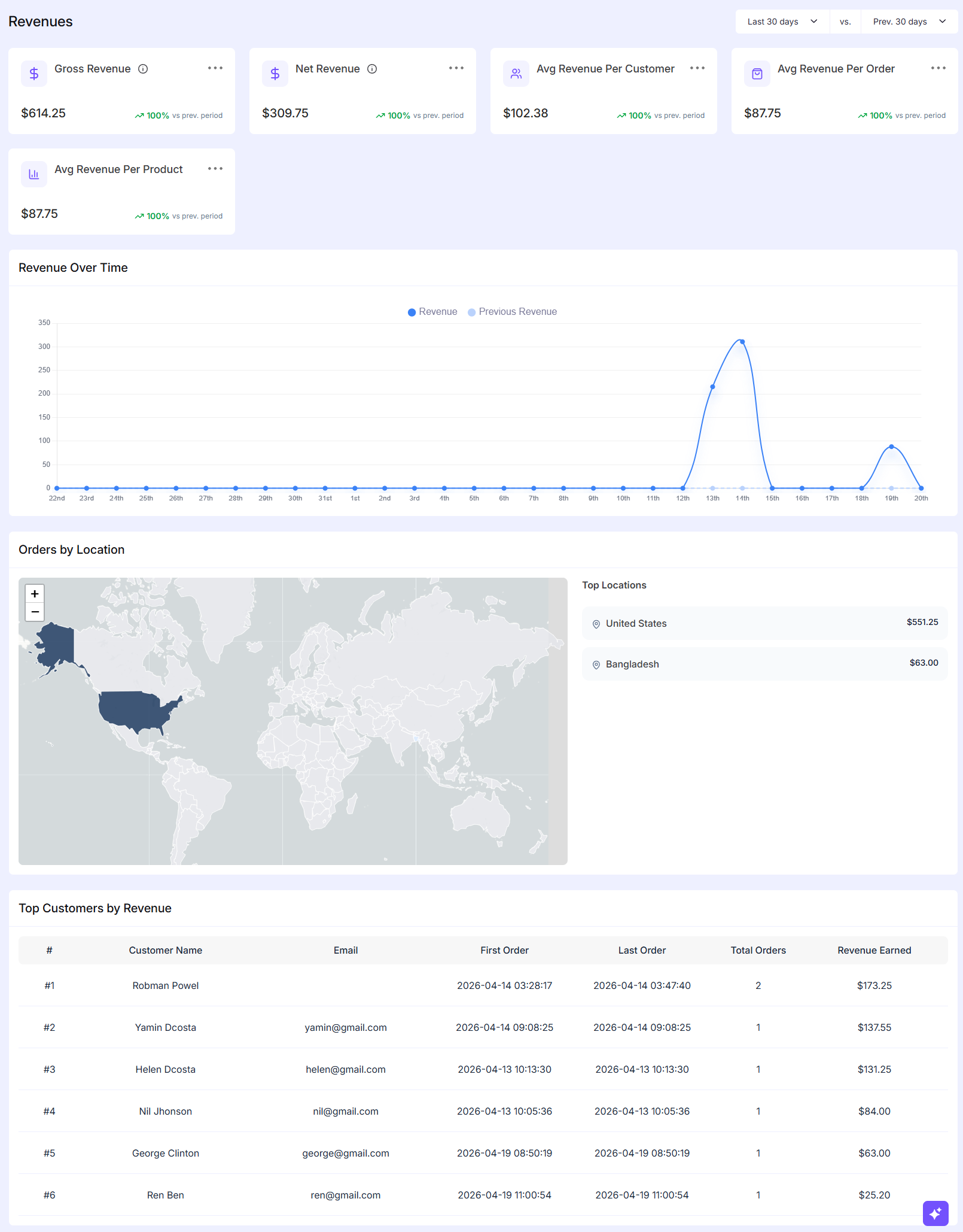 The Revenues Reports section in EasyCommerce gives a quick view of your store’s earnings, including total and net revenue, average values, sales trends, top locations, and highest-spending customers all in one place for easy understanding.